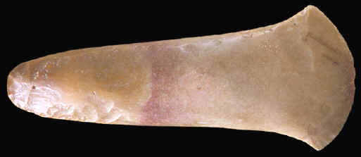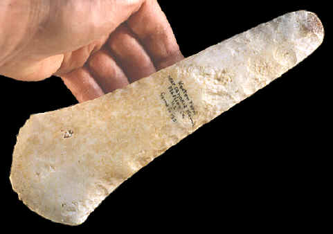 Some of the more logical explanations for the use of spuds fall into two categories. The most often suggested theory is that they were ceremonial or display axes that were never used for anything except for ritual events. Another explanation, at least for some of them, is that they were used as weapons. Many of the spuds illustrated in this article might be considered to be comparable to battle axes from northern Europe. The weight for a couple of the spuds illustrated here is the same as the battle axes also illustrated in this article. Dr. Joseph Jones is quoted, early in the last century, as saying "It's possible that they (spuds) may have been used-------as warlike weapons, since it would be easy to cleave or fracture the human skull with a single blow from one of these stone implements." |