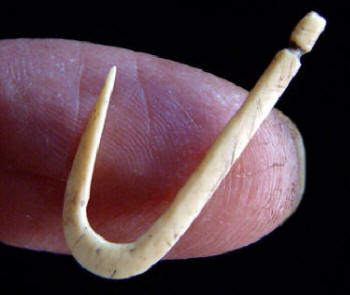 fishhook appears to be made from deer bone and possibly the toe bone of