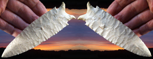 CLICK ON PICTURE FOR LARGER IMAGE This picture shows three views of the original fluted point before the one ear was restored.