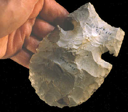 Notched hoes were used to cultivate the soil. Evidence of this can be seen on the edges which have a very high surface polish. These edges appear as though a coating of clear nail polish has been applied. The polished surface is caused from the cutting of plants that form a build up of a material called opal phytolith. Some of the agricultural products these hoes would have been used to cultivate were corn, beans and squash. |