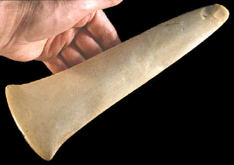 Spuds apparently date to the end of the Woodland period. Pecked and ground granite spuds have been found on Jersey Bluff sites that differ in shape from those found at Cahokia. Jersey Bluff spuds have not been found on excavated sites. Spuds continued to be made in various forms throughout the Mississippian period until European contact, when the wide stemmed & perforated class C type of spuds were being made. B. W. Stevens reports that "Frequently this type of ax (spud, class C) has been discovered in mound burials with historic material, such as Venetian glass beads, bronze sleigh bells, copper powder buckets, glass rum bottles and other historic objects. He also writes that "Very likely the battle ax of the early Spanish solders was the incentive that prompted the Indian to imitate in stone this broad blade weapon that captured his primitive fancy." An estimated date for spuds might range between A.D. 720 to 1650. |