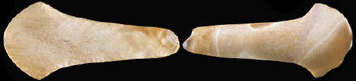 Gerard Fowke wrote that "they (spuds) bear no marks of rough usage." B W. Stevens writes, concerning class C spuds, that "Occasionally the blade of some of these axes (he refers to them as ceremonial axes) show a small chip broken from the blade---. Many of these chips indicate that the Indian re-worked such damage, by smoothing out the chip by grinding and polishing." Many spuds do seem to have been damaged along the bit and some of them were repaired. A certain percentage of spuds were being used in a way that did cause their blade edges to become damaged. But the wear pattern on most spuds isn't the same as tools that were being used for wood working and agriculture. |