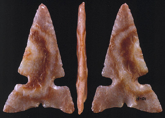 Cahokia points were named by Edward G. Scully after the Cahokia site in Madison and St. Clair Counties in southern Illinois. An estimated date for the Cahokia Mounds site and the Mississippian people who lived there is between A.D. 900 and A.D. 1300. Many different styles of arrow points were produced at Cahokia during this time period. Multi-notched Cahokia points, including triple-notched points, were made during the early period at Cahokia. Double-notched Cahokia points were made during the middle period and the latest period arrow points made at Cahokia are un-notched. |