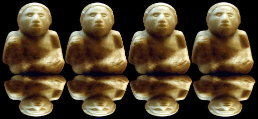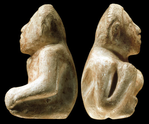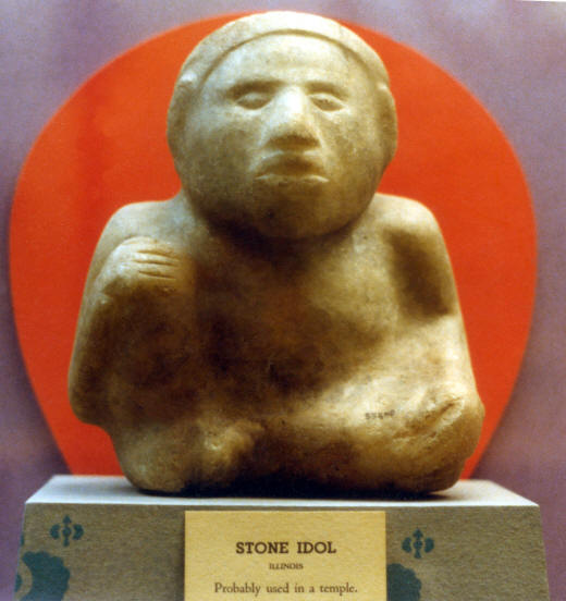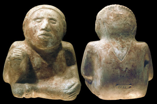 This article illustrates two different images of the Anna figure. One shows the original figure as it once appeared on display in the Chicago Field Museum. The other representation is a plaster cast that was molded from the original sometime in the late 1800's for a display that included casts of other North American artifacts for the Chicago World's Fair in 1893. The casting project is reported to have occurred at Princeton University. This cast is located in Lithic Casting Lab's collection of casts. The Smithsonian is also reported to have a cast. |