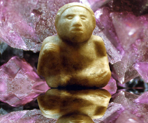 The Anna figure is reported to have been discovered by Thomas M. Perrine while excavating a mound in Union County, Illinois in 1873. Thomas Wilson reports in 1896, "Prehistoric Art," under a drawing of the Anna figure, which he claims to be "a specimen of the same type" from Union County, that it's made of clay. But in fact the drawing must have been copied from the Smithsonian's cast of the Anna figure. No other figure of this type and size is known from Union County, Illinois. Also, Mr. T. M. Perrine reported that the figure he discovered was made of white porphyry. The Anna figure material was finally correctly identified as fluorspar or fluorite by Wilson in 1898. The Anna figure was in fact made from a large "yellowish" semi-translucent fluorite crystal. |