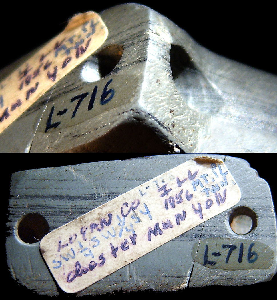 Birdstones were also drilled for attachment. Holes were placed on the bottom at the front and back edges. Most birdstones were drilled with stone bits with the use of quartzite grit and water. A tapered flint drill will cut a conical hole 1/2 inch (1.2 cm) deep in slate in about ten minutes. There is also evidence that show these holes were used for some type of significant attachment. Many birdstones have been found that have their holes broken away. So it's likely they were fastened to something more than feathers or small items as a fetish would be used. |