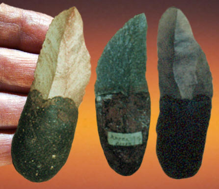 Indigenous Australian's were manufacturing stone tools for more than 40,000 years. The flaked stone tools they left behind are very simple. In fact, most of their hafted knives, spears and fighting picks were made from simple core struck blades that have little or no further modification. Bifacial flaking in Australia is rare compared to other regions of the world. The best examples are reported as large hand axe-like bifaces and small bifacially flaked points. Bifacial reduction is also reported in the manufacture of some ground stone axes. Australia's most famous bifacially flaked artifact is the more recent Kimberly point. The most famous blade knife is the resin hafted leilira knife. |