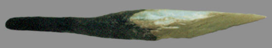 Leilira macroblade knives were manufactured by a simple core and blade technology. The blades were percussion struck from cores with hard hammers (stone hammer). Historic accounts report that the goal of the aboriginal flintknapper was to remove pointed blades from the core with minimal additional shaping of the blade. It's reported that macroblades were manufactured into the 1980's. Besides their use as leilira knives they were also hafted onto atlatl darts and fighting picks. Although there are many different sizes given for macroblades. Any length above 5 cm (2 inches) seems to be an acceptable macroblade size. |