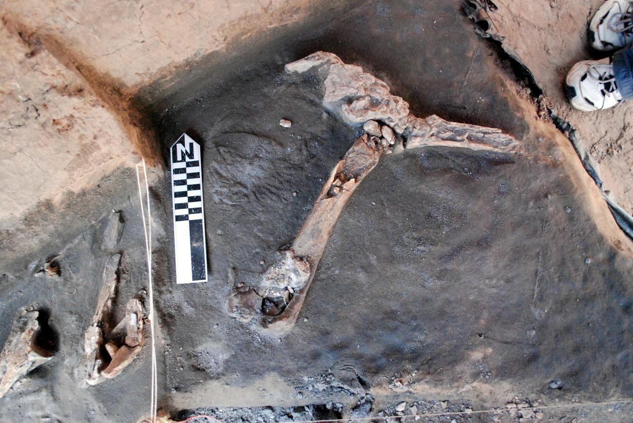 This picture was taken sometime between 2009 and 2011 of an excavated area at Blackwater Draw. It shows what appears to be mostly bison bones that may not be from an extinct variety. The excavation level is in the Archaic / late Paleo-Indian period stratum E just above the Folsom occupation zone.
