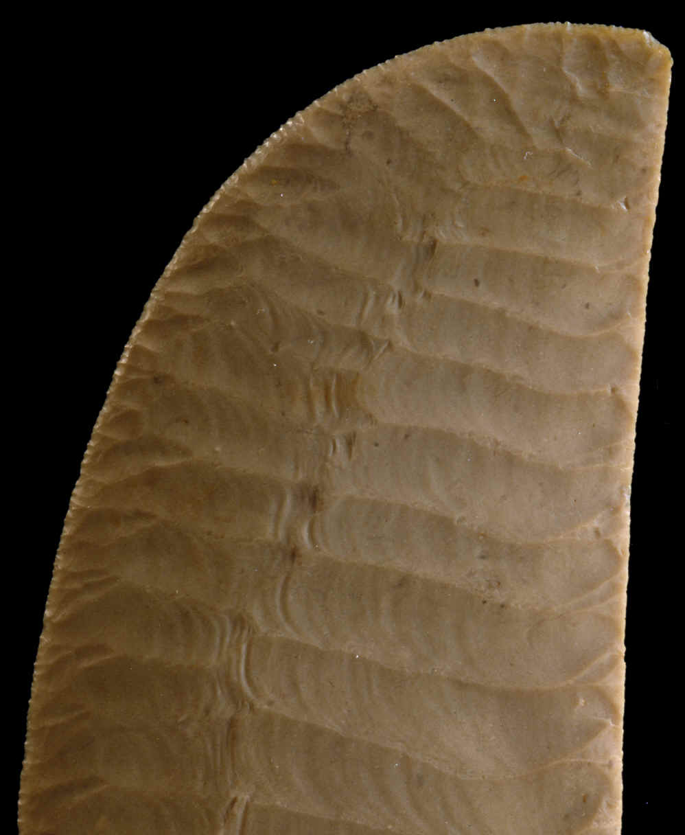 RIPPLE FLAKED KNIFE This pictures shows a magnified area on the point of this knife. Notice the fine retouch pressure flaking along the cutting edge and the delta shapes between the long